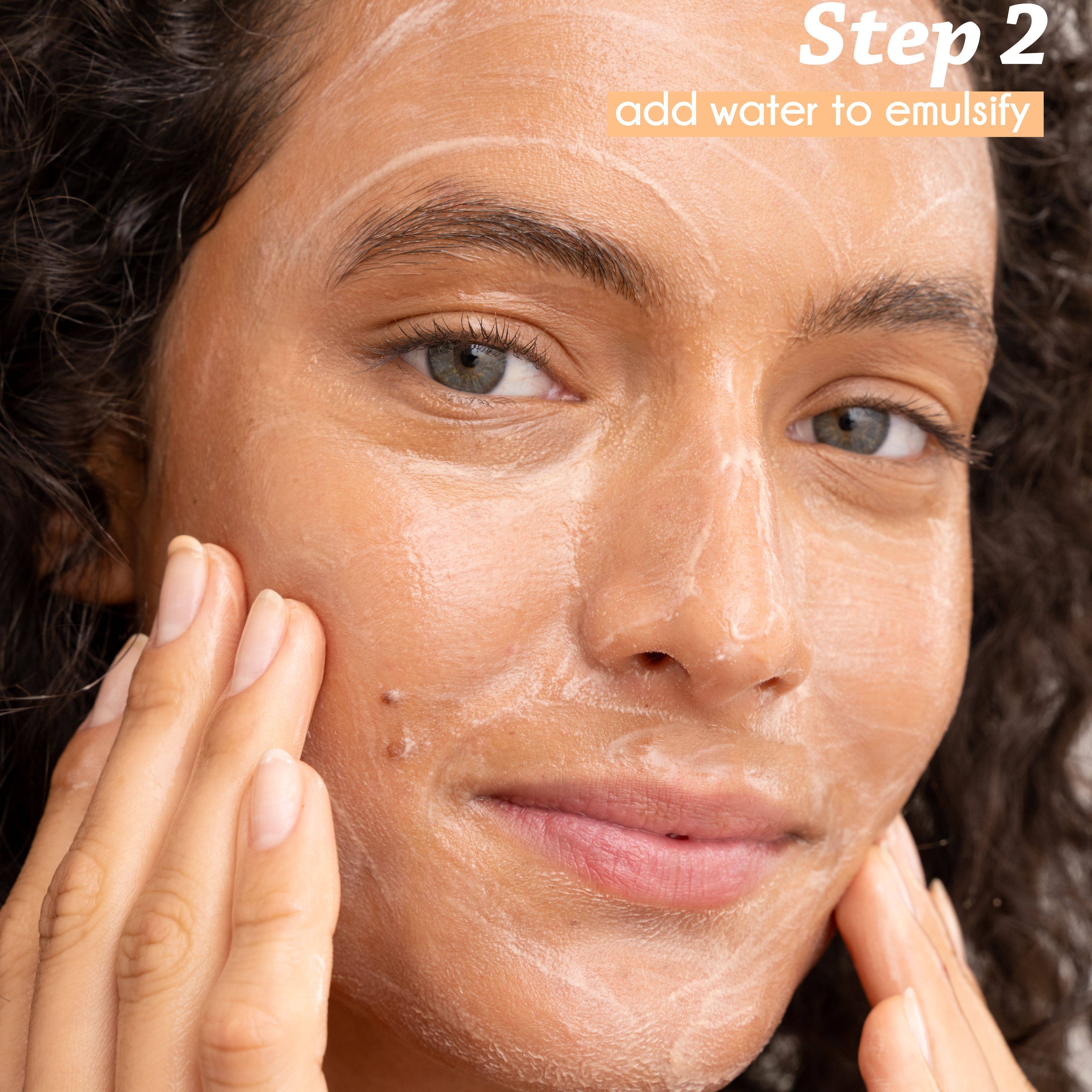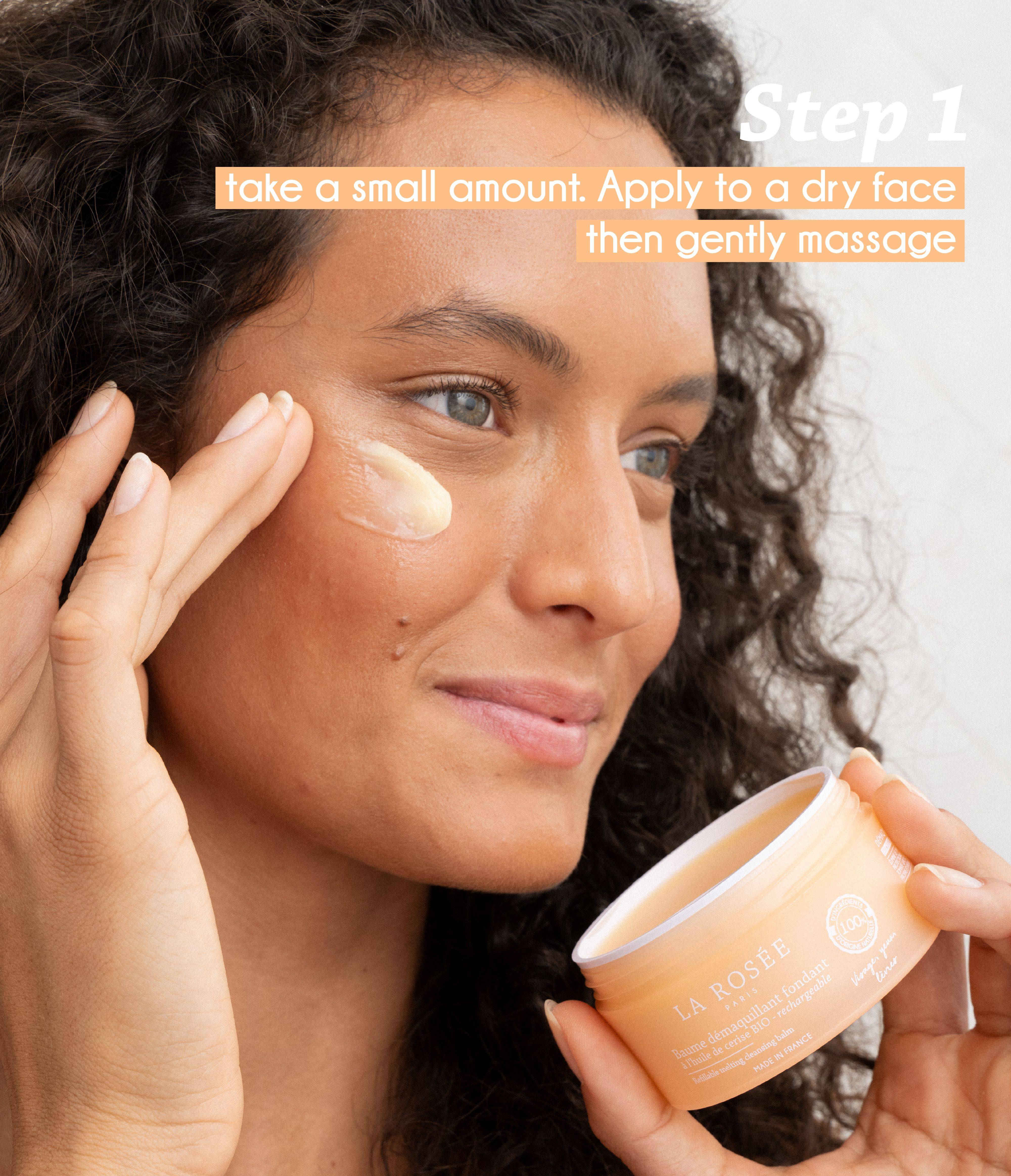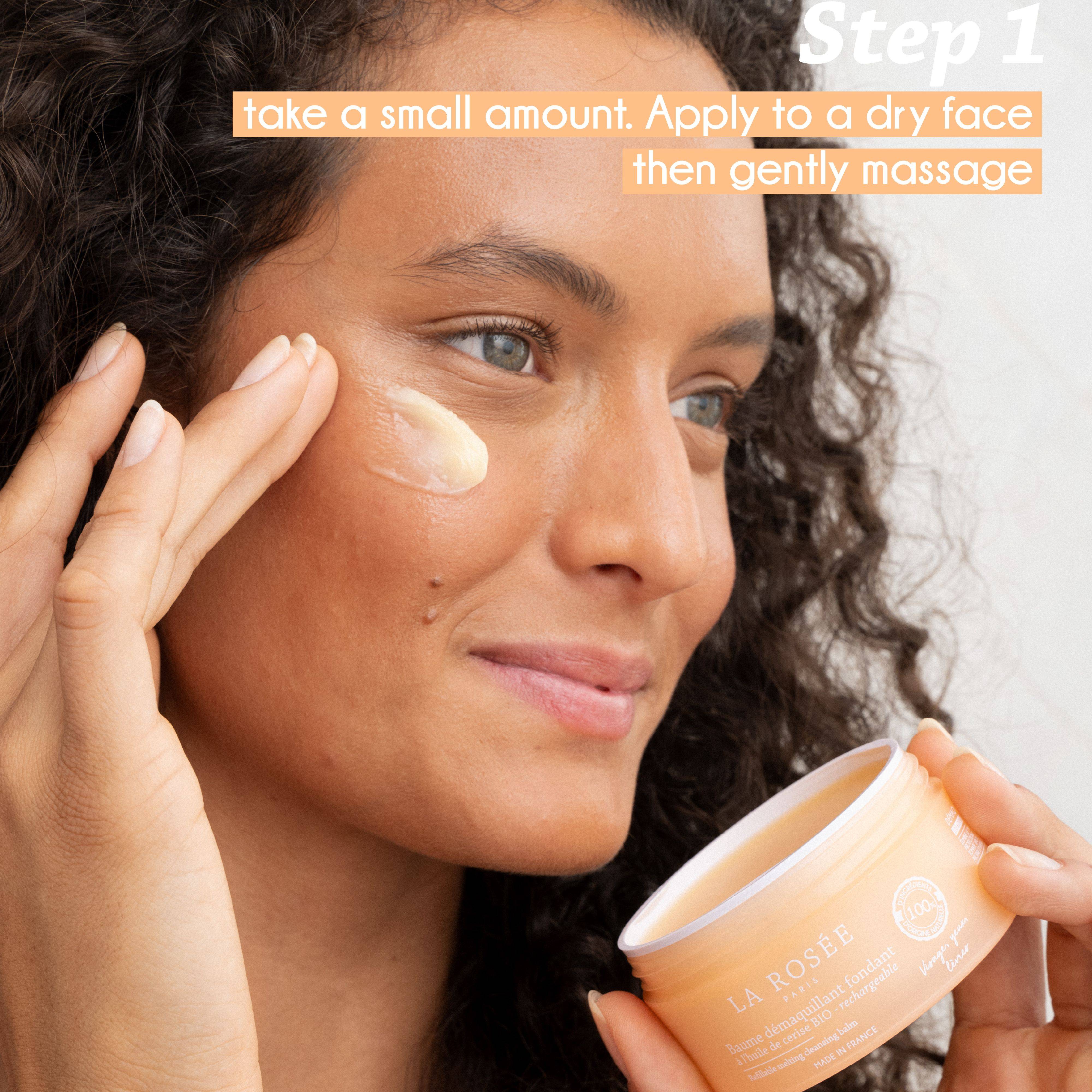 Our 2-in-1 Refillable Melting Cleansing Balm, enriched with upcycled organic cherry kernel oil, removes all types of makeup—even waterproof—while thoroughly cleansing the skin and delivering lasting hydration.